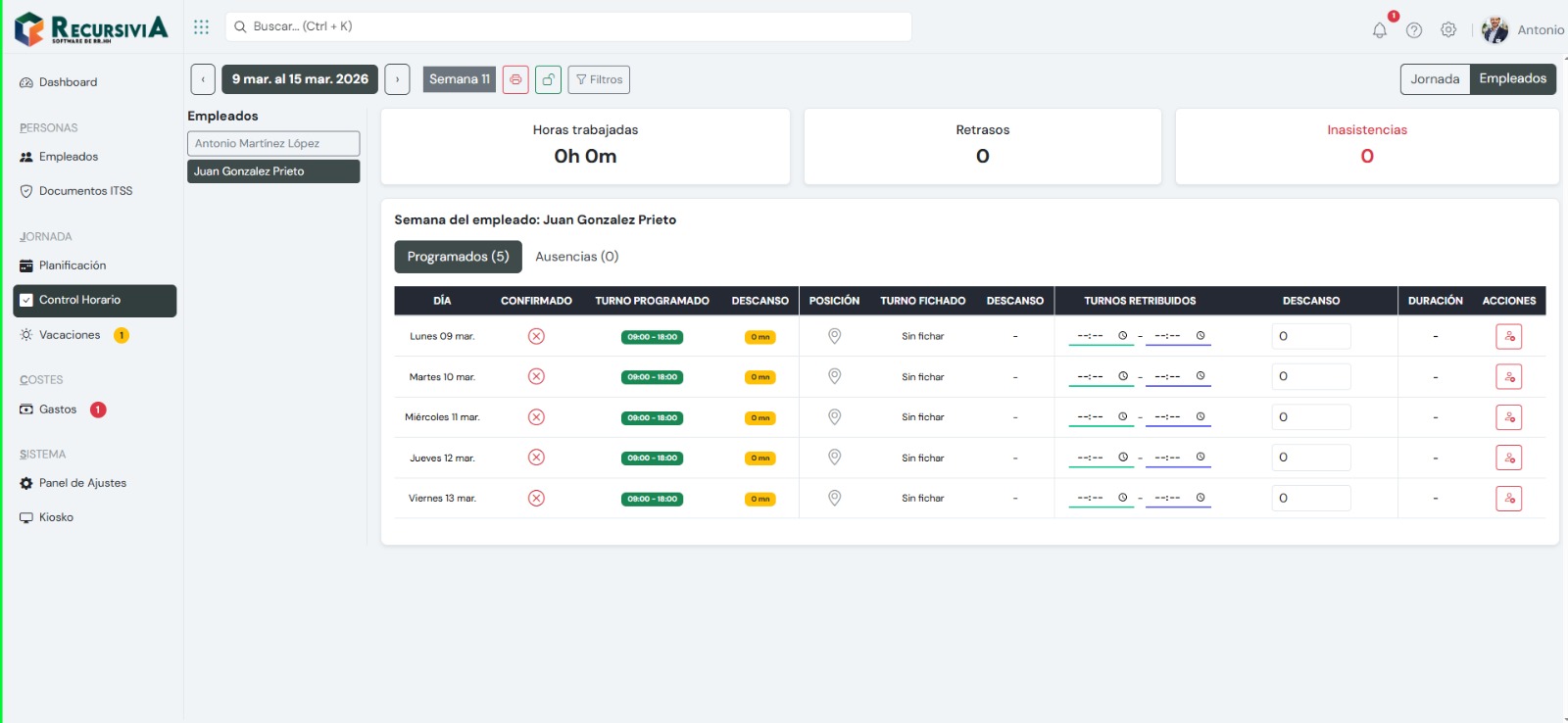 Gestión de jornada laboral, turnos y ausencias.