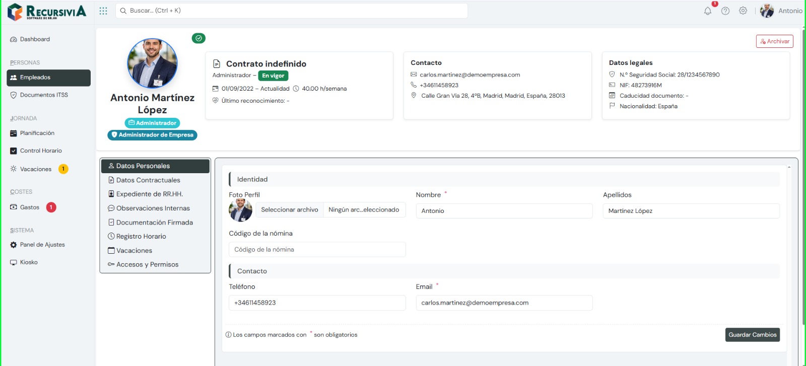 Accede a fichas de empleados, documentación, contratos y estructura organizativa.